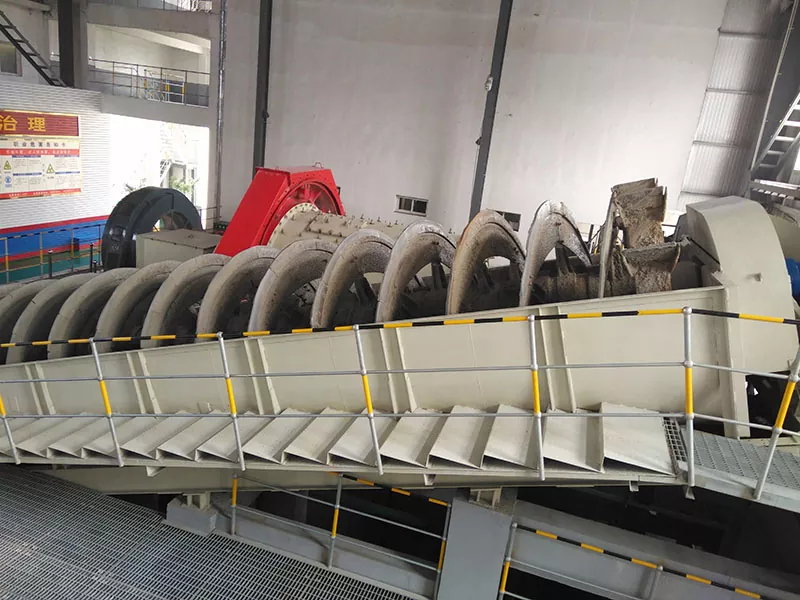 Погруженный спиральный классификатор - это устройство для оценивания, которое использует принцип, согласно которому твердые частицы разных размеров и удельная тяжесть имеют разные скорости оседания в жидкостях. Тонкие частицы руды плавают в воде и переполнены, в то время как грубые рудные частицы опускаются в нижнюю часть резервуара и выдвигаются к верхней части спирали для разряда. Спираль вращается на низкой скорости, перемешивая суспензию, так что мелкие частицы подвешены на поверхности и переполняются на переполнении, в то время как грубые частицы опускаются в нижнюю часть резервуара и транспортируются в порт разряда спиралью для разряда в качестве возвращаемого песка.